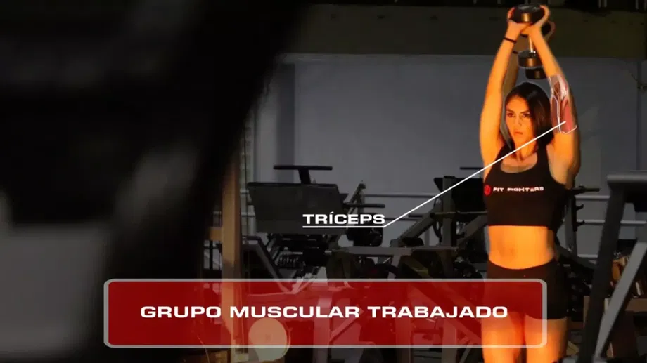 Posición de Inicio: Eleva la mancuerna sobre tu cabeza, manteniendo los brazos completamente extendidos.