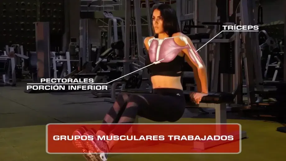 - Coloca tus manos al borde del banco, manteniéndolas cerca de tu cuerpo. Asegúrate de que la espalda esté recta y las piernas extendidas.