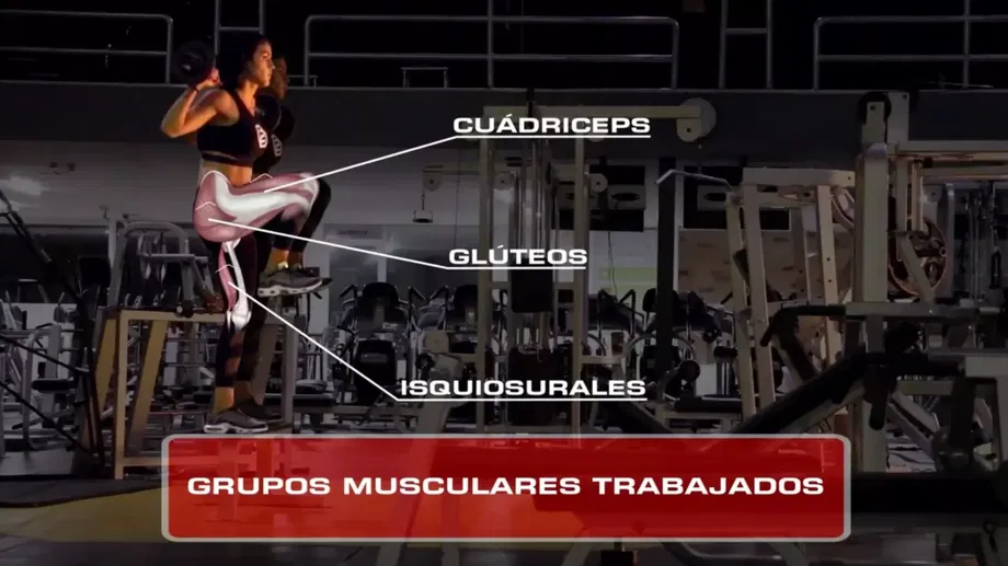- Apoyándote firmemente en el pie que está sobre el banco, inicia la elevación de tu cuerpo. Utiliza la pierna que está sobre el banco como el principal impulsor del movimiento, guiando la elevación con la rodilla.